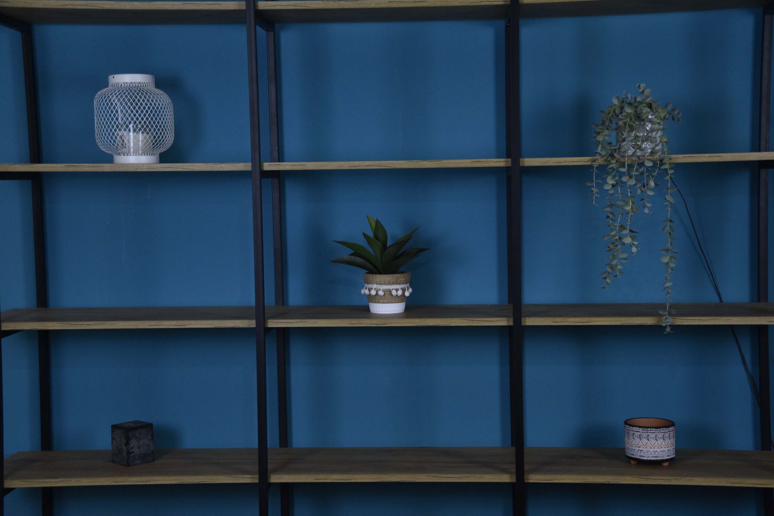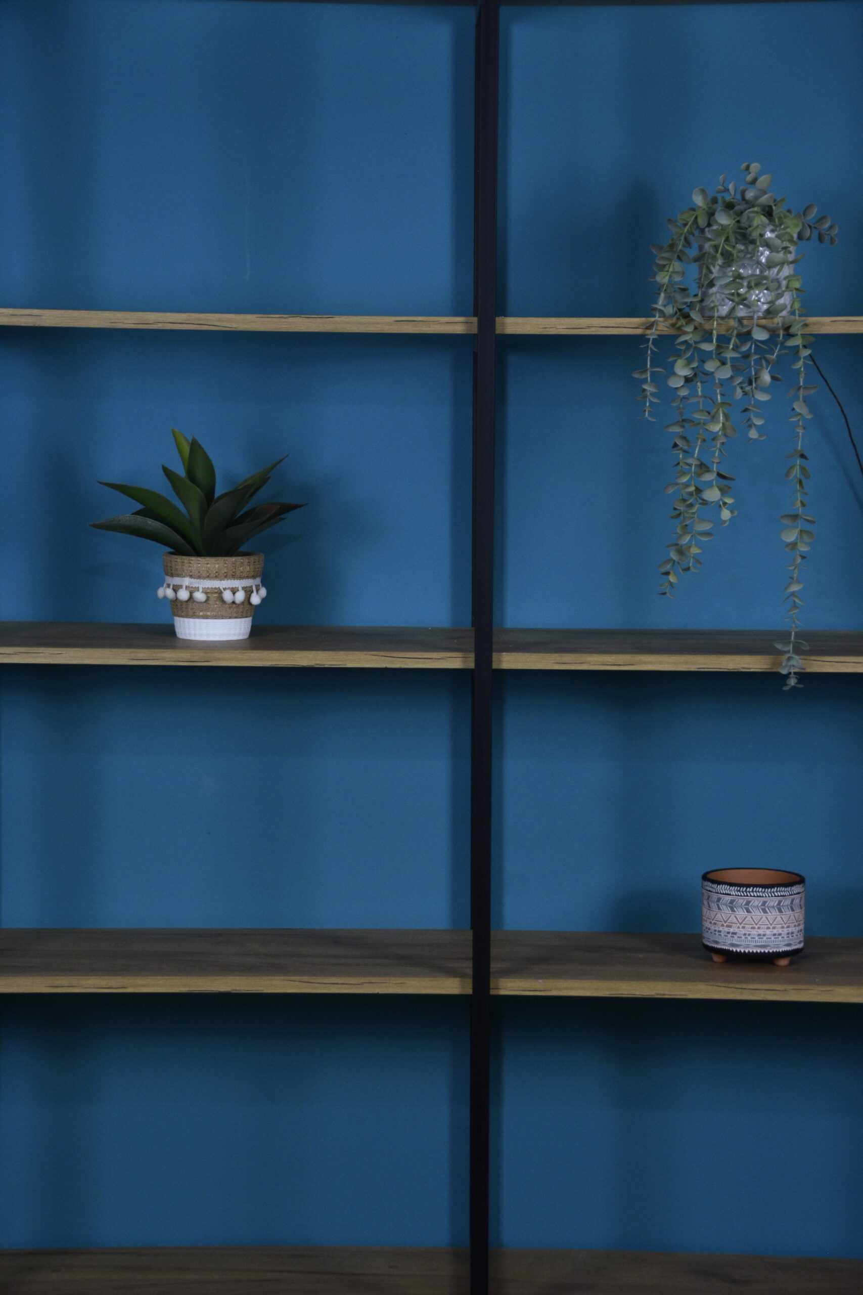 Βιβλιοθήκη κατασκευασμένη από μελαμίνη υψηλής αντοχής και μεταλλικά στηρίγματα βαμμένα μαύρα με ηλεκτροστατική βαφή.Το κάτω μέρος αποτελείται από 3 ντουλαπάκια ώστε να υπάρχει επιπλέον αποθηκευτικός χώρος.
